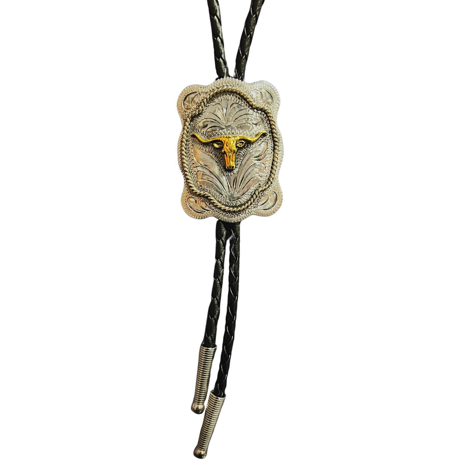 The oval design of the tie creates a captivating frame for the centerpiece – a majestic Longhorn emblem in shining silver and gold tones. The intricate detailing of the Longhorn pays homage to the rugged spirit of the American West, making this bolo tie a true statement piece.