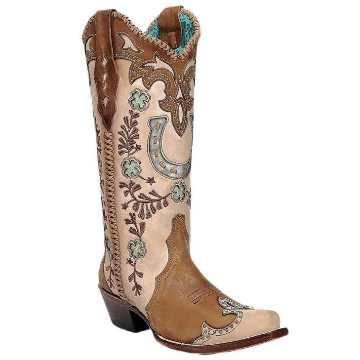 This stunning design combines delicate floral embroidery with a charming horseshoe motif for authentic cowgirl appeal. The 13-inch shaft showcases intricate needlework that catches every eye, while the snip toe silhouette keeps things refined. Built for all-day comfort with easy pull-on straps, and a cushioned leather insole, these boots deliver style without sacrifice. Premium smooth leather lining and a durable leather sole with a 2-inch heel ensure lasting wear. Perfect for ranch days or nights out, this boot proves Western wear can be both tough and timelessly feminine.