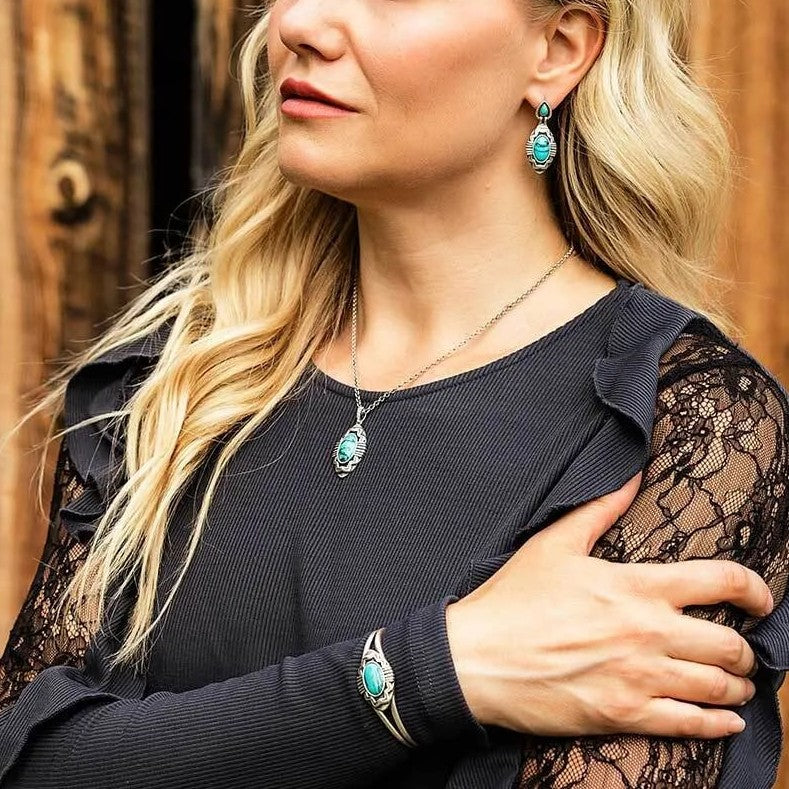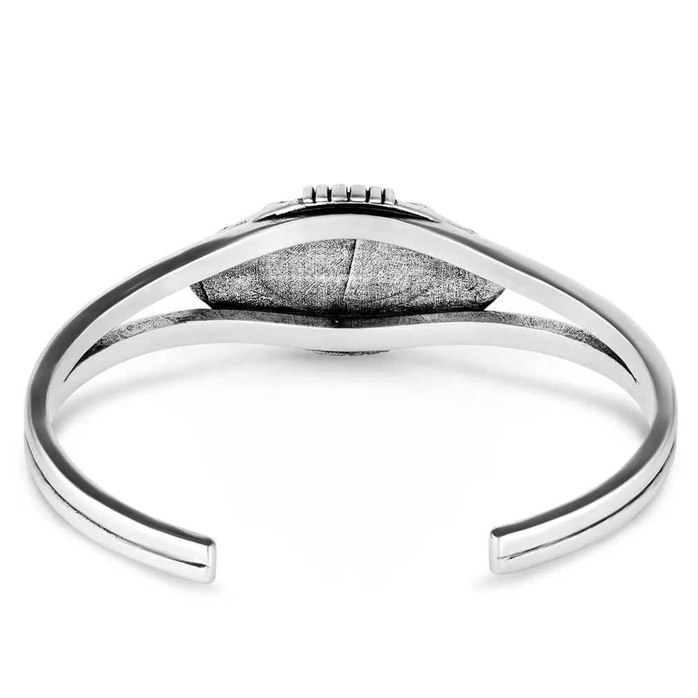 Give your outfit a little Southwestern flair with the Blue Mesa Turquoise Bracelet. The design features a gorgeous Southwest styled etching in a beautiful silver tone that frames the center oval turquoise stone. A light antiquing shows the details in the design giving the cuff a more dynamic look. Two smooth silver tone pieces at the top and bottom wrap around your wrist to create the cuff bracelet. One size fits most. Stone color may vary.