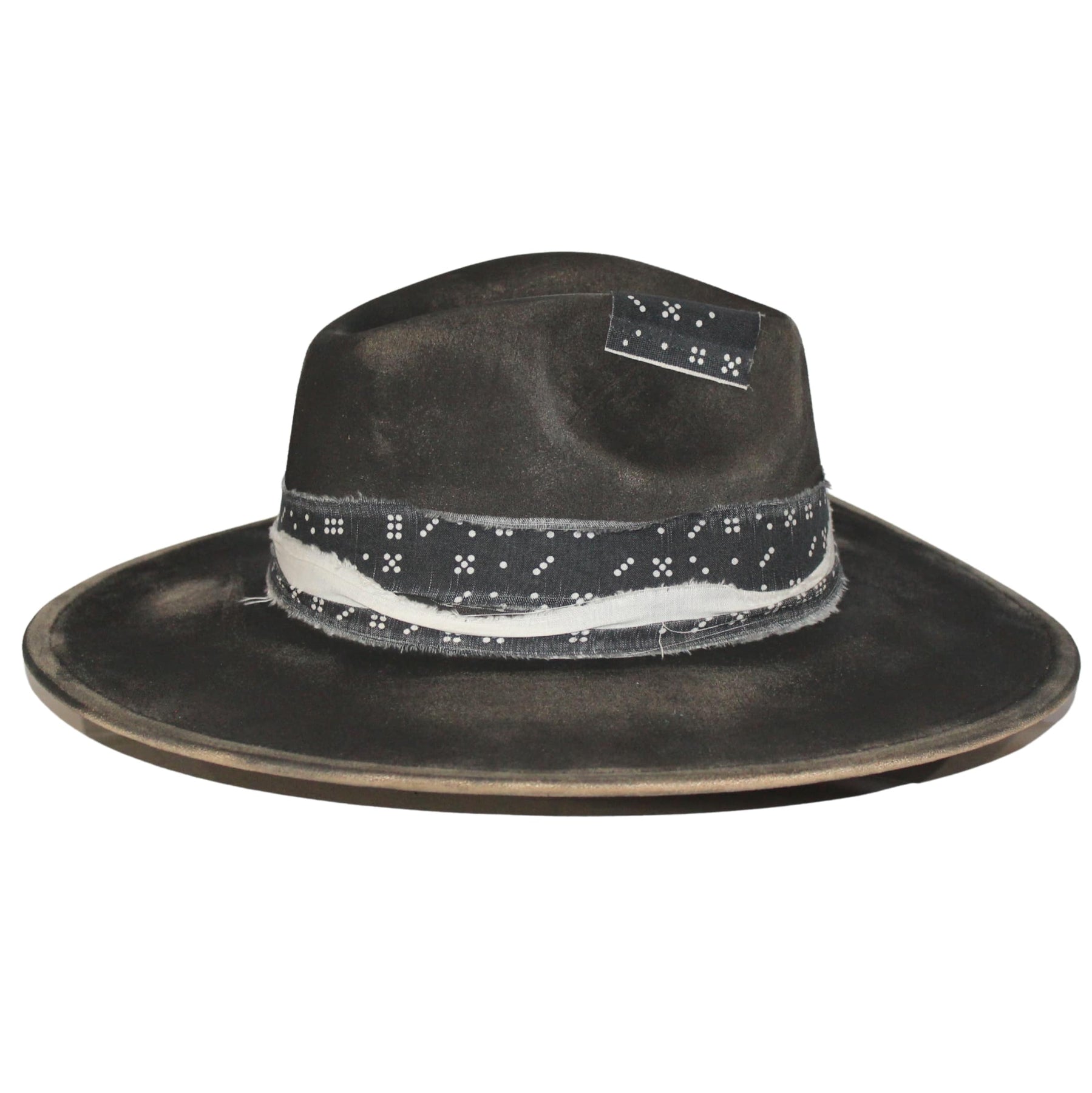 Betsy Simmons introduces the Black Fated wool flat brim hat. Betsy Simmons is a unique designer who creates custom hats. This is truly a ONE OF A KIND original.